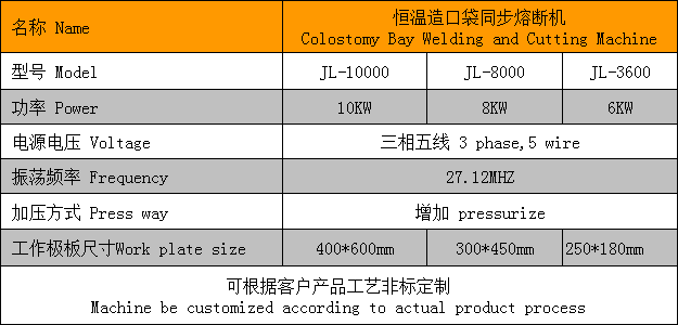 造口袋的機器工作原理原理:利用高壓整流刺激高頻電子管震蕩瞬間產生高頻電磁波電場,被加工的塑膠材料,在電磁波電場內發生分子極性化變化生熱,而焊接在一起。